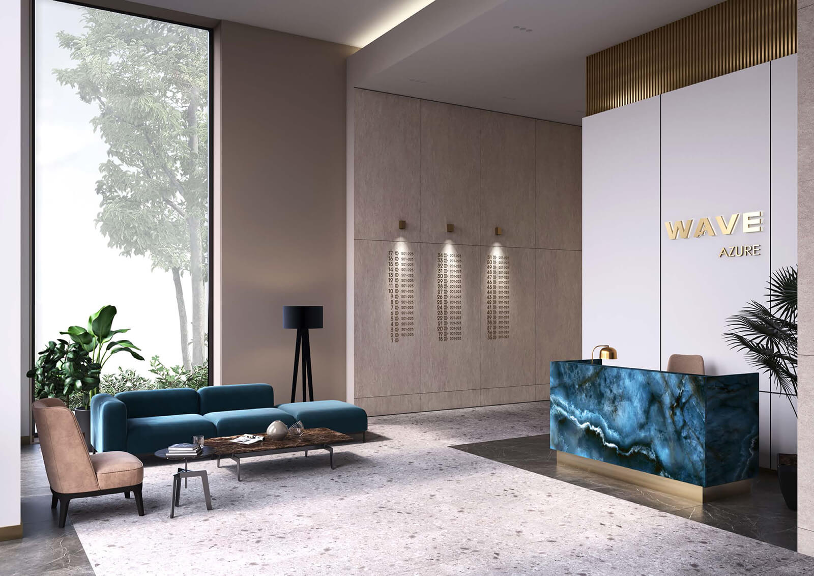 Дизайн лобби в WAVE выполнен в современном стиле и сочетает простые формы, но при этом использует интересные цвета и текстуры. Цветовая гамма интерьеров каждого здания отсылает к «Оттенкам синего», так называется первая очередь строительства. Стильное пространство лобби разделено на несколько зон: впечатляющий ресепшен, уютная зона ожидания с мягкими креслами и просторный лифтовый холл.