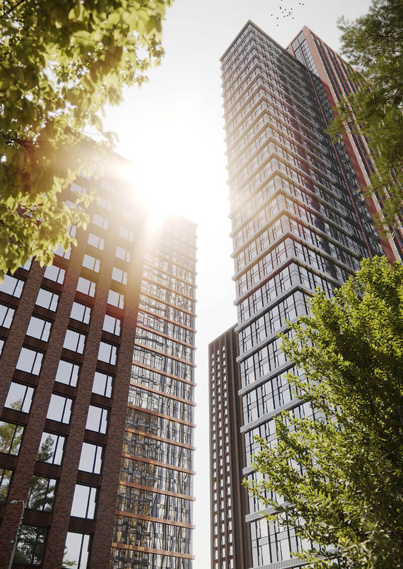 Фасады башен будут иметь свой характер и в то же время сочетаться с соседними зданиями, создавая единый архитектурный ансамбль. Отделка фасадов 2-го и 4-го корпусов будет выполнена из клинкерной плитки, придавая им контрастности. Использование нескольких видов материалов позволит создать интересный и современный облик жилого комплекса.